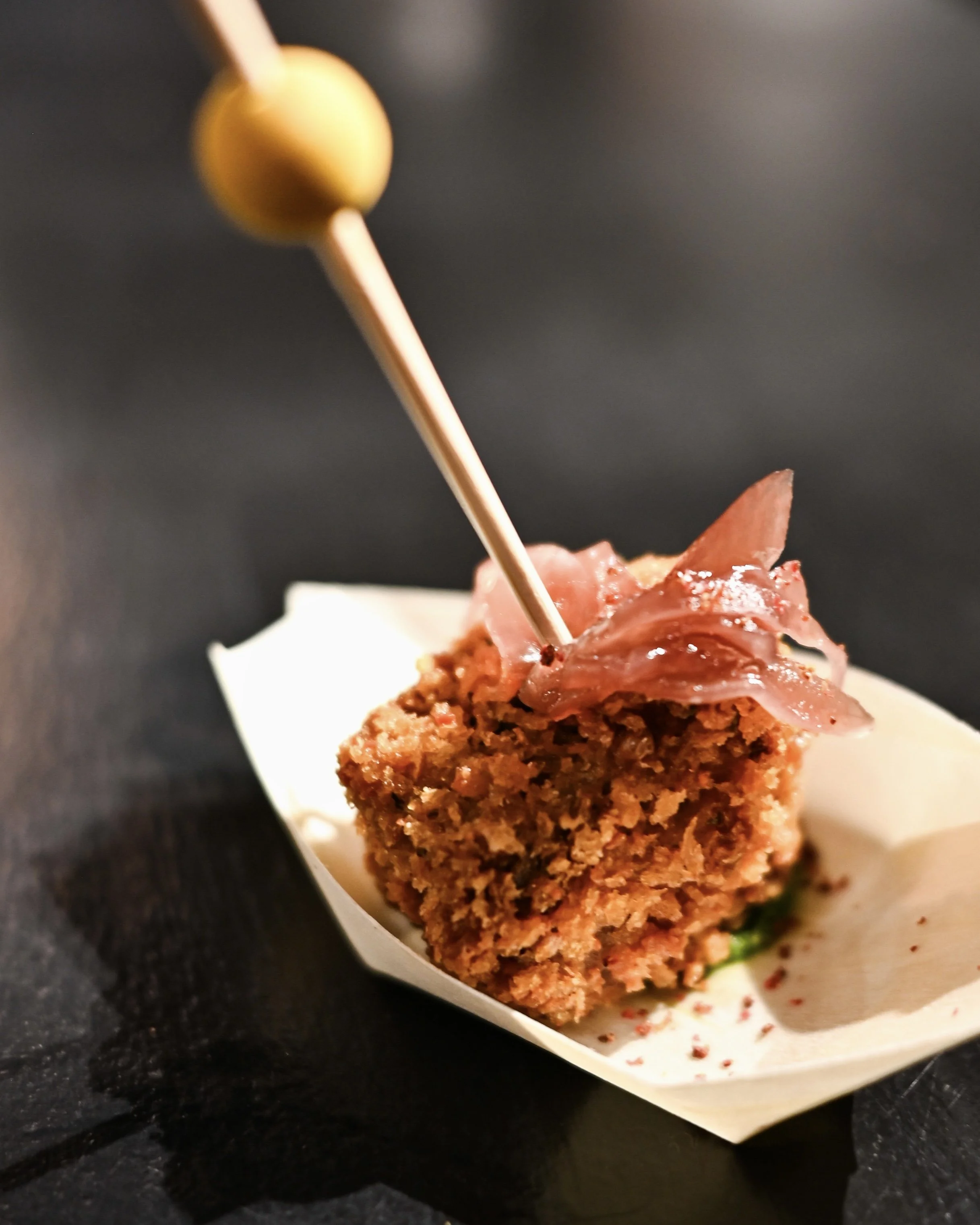 Encompassing the entire venue with walk about table-to-table self-service, this unique event highlighted thoughtful, small serving dishes with the chefs on hand, busily prepping and kindly dispensing not only their innovations, but their thoughts on them.
