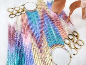 Alice refers to her colour wheel to find themes for her unique beaded earring designs, which can be five to 18 inches in length. “I have really long hair, and my hair inspired the length of the really long [earrings],” she says. Alice also works with manufacturers to get the wearable art onto clothing like hoodies and T-shirts that will stay relevant for years to come. “I find manufacturers, usually Canadian-based, to get my mother's images on types of clothing that we think people will still find fashionable 10 years down the line,” Alice says.
